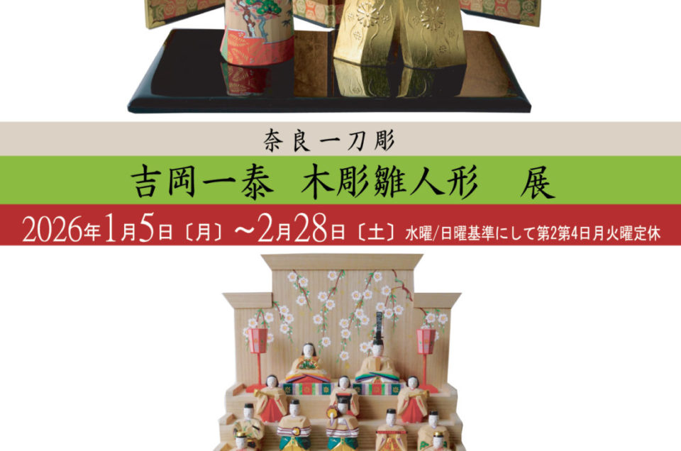 奈 良 一 刀 彫 吉岡一泰 木彫雛人形 展 2026年1月5日〔月〕~2月28日〔土〕 水曜/日曜日基準に第2第4日曜定休 11-19 ●木曾のヒノキやヒバ材を精魂込めて彫り 日本画の絵具と本金箔を用いて彩色し 伝統をふまえた本格的な品格ある ...